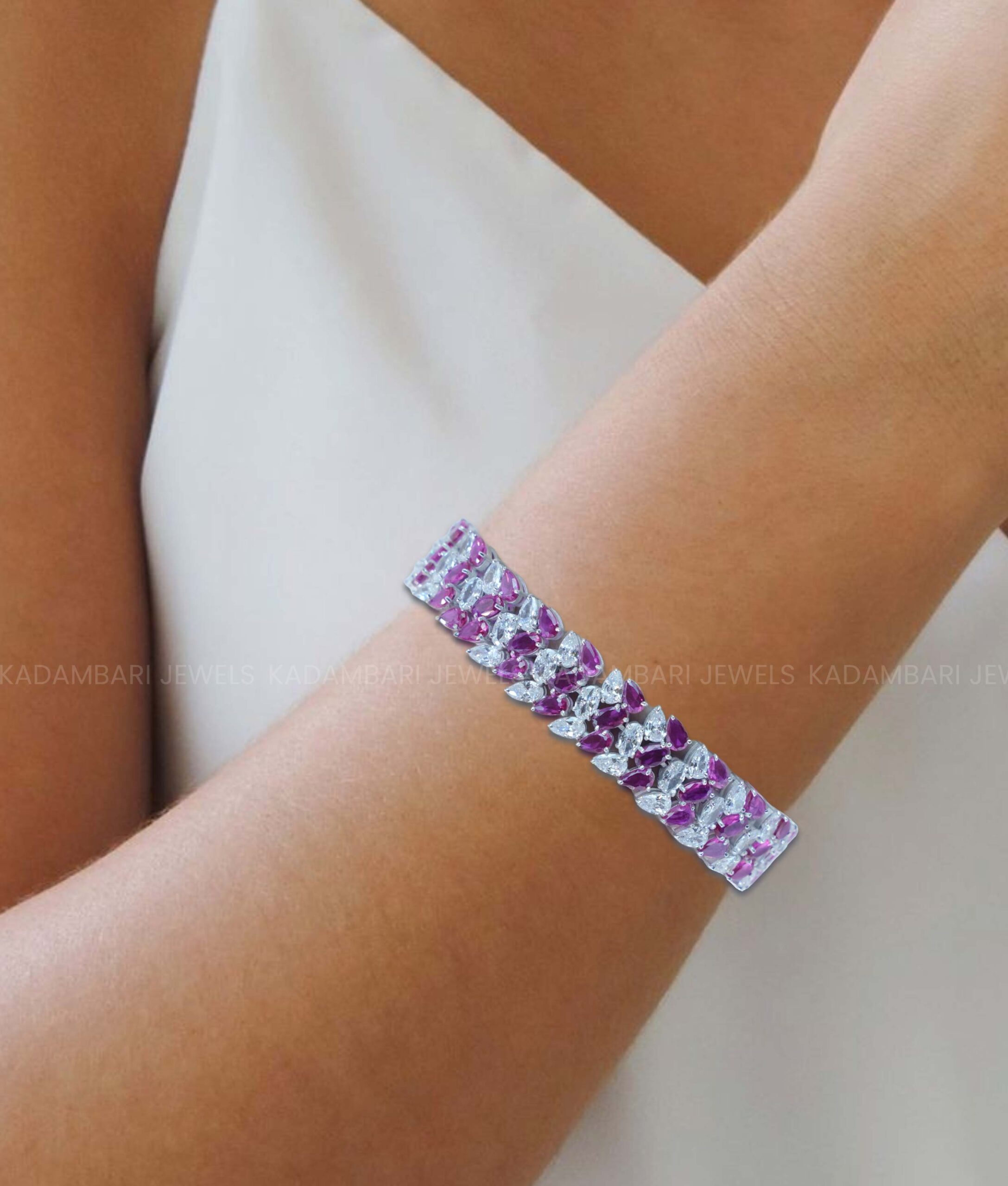 A bold and luxurious cuff bangle with a striking woven pattern of marquise-cut pink rubies and sparkling white diamonds. The wide, intricate design provides a significant presence on the wrist. This piece is a celebration of color and texture, perfect for making a memorable impression.