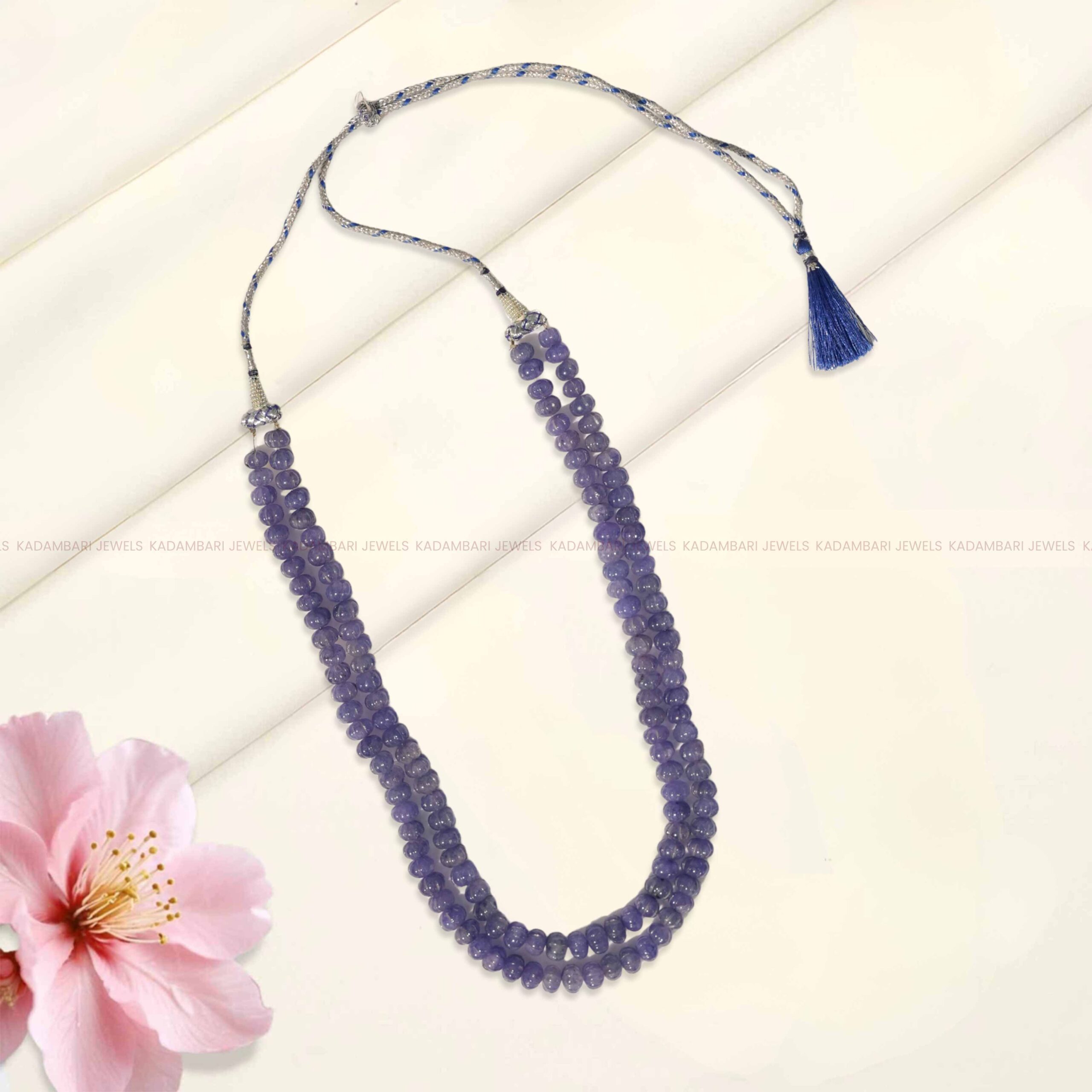A graceful double-strand maala featuring luminous violet-blue tanzanite beads. The two layers create a classic and timeless silhouette, perfect for adding a subtle pop of color and elegance to any attire. The adjustable string with a blue tassel complements the stones perfectly