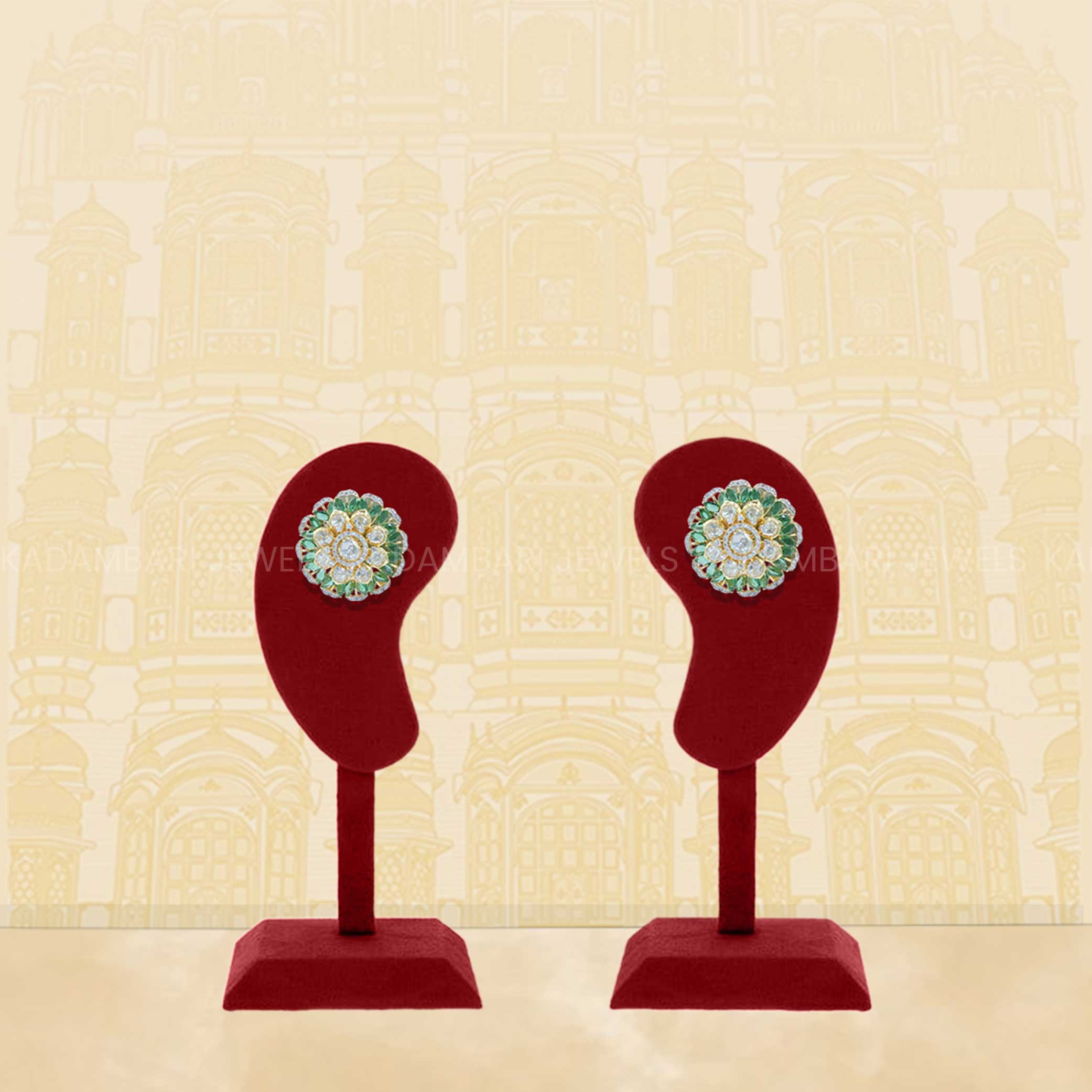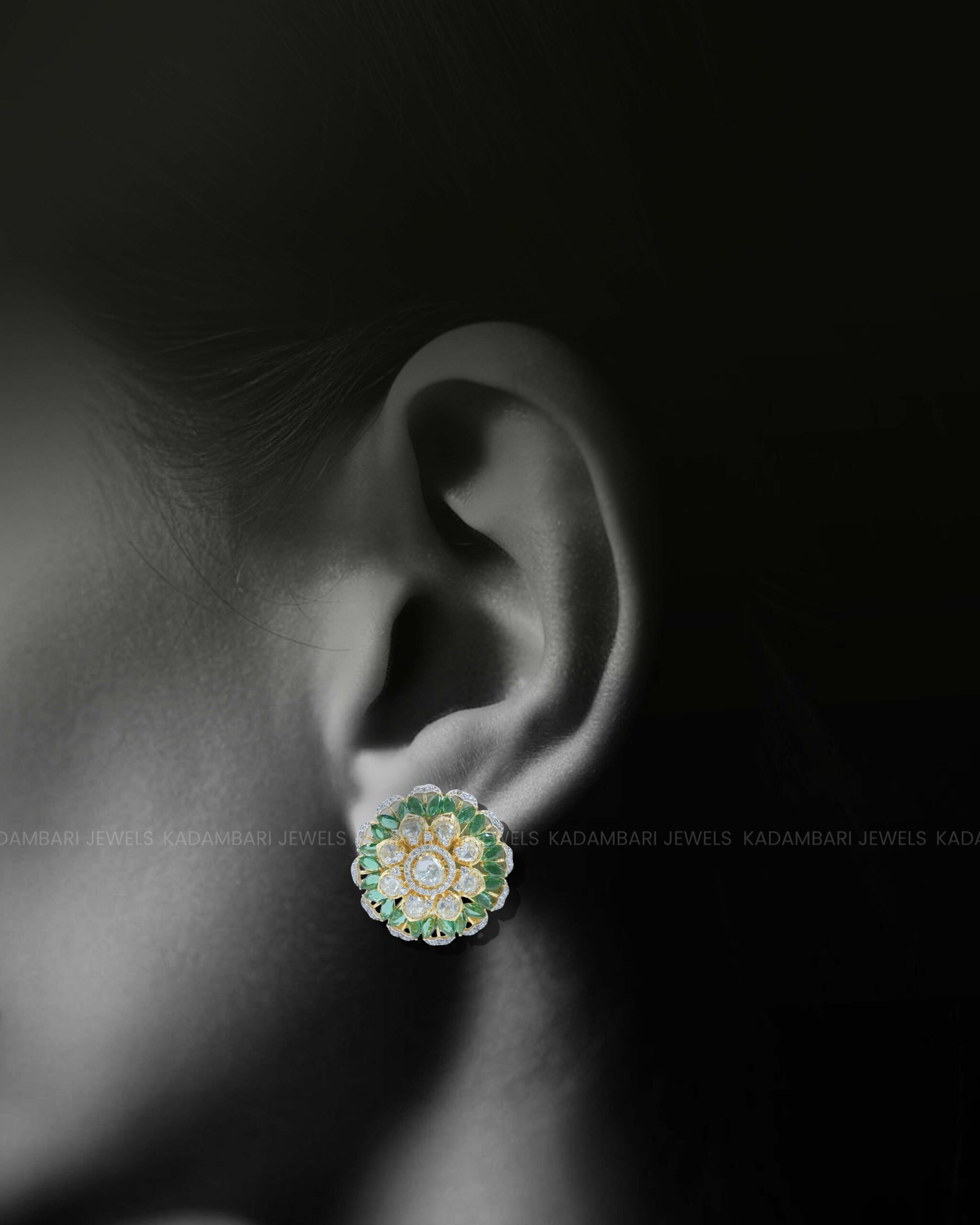 Capture the beauty of nature with these exquisite floral stud earrings from Kadambari Jewels. Featuring vibrant green gemstones (likely emeralds) forming delicate petals around a sparkling diamond center, they are a refreshing addition to your collection