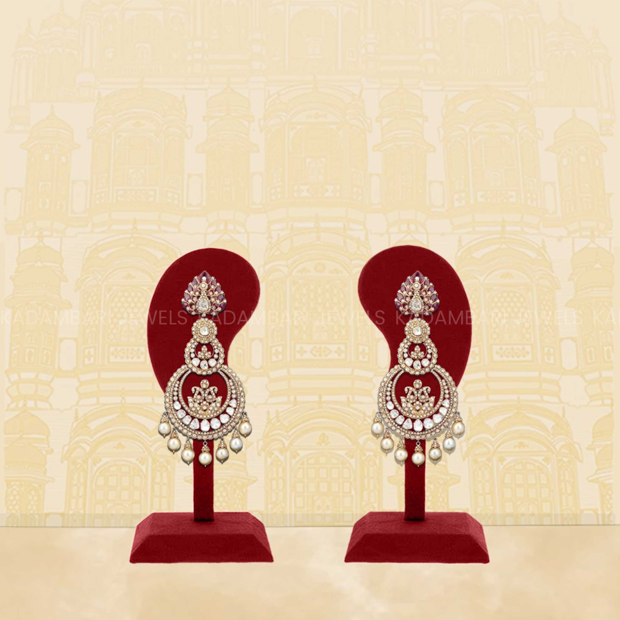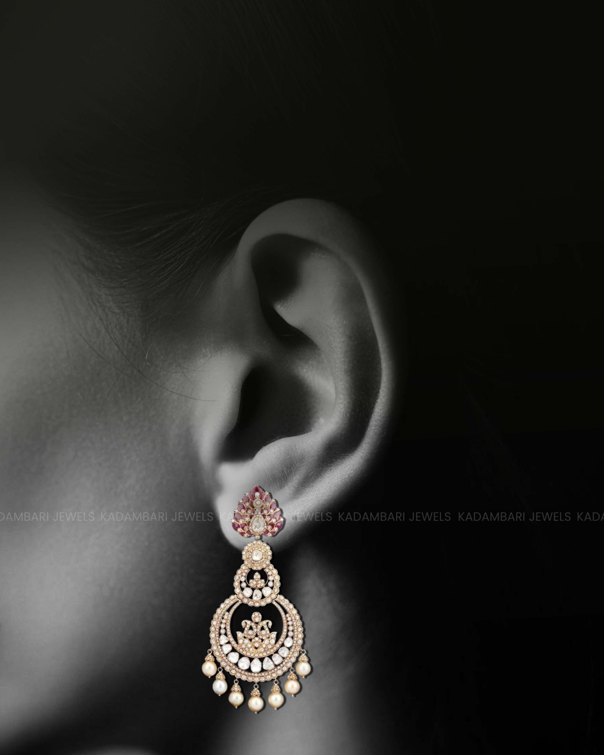 A masterpiece of design, these Kadambari Jewels Chandbali earrings feature a striking ruby-studded top leading to an opulent crescent adorned with sparkling diamonds and lustrous pearl drops. Perfect for making a grand entrance.