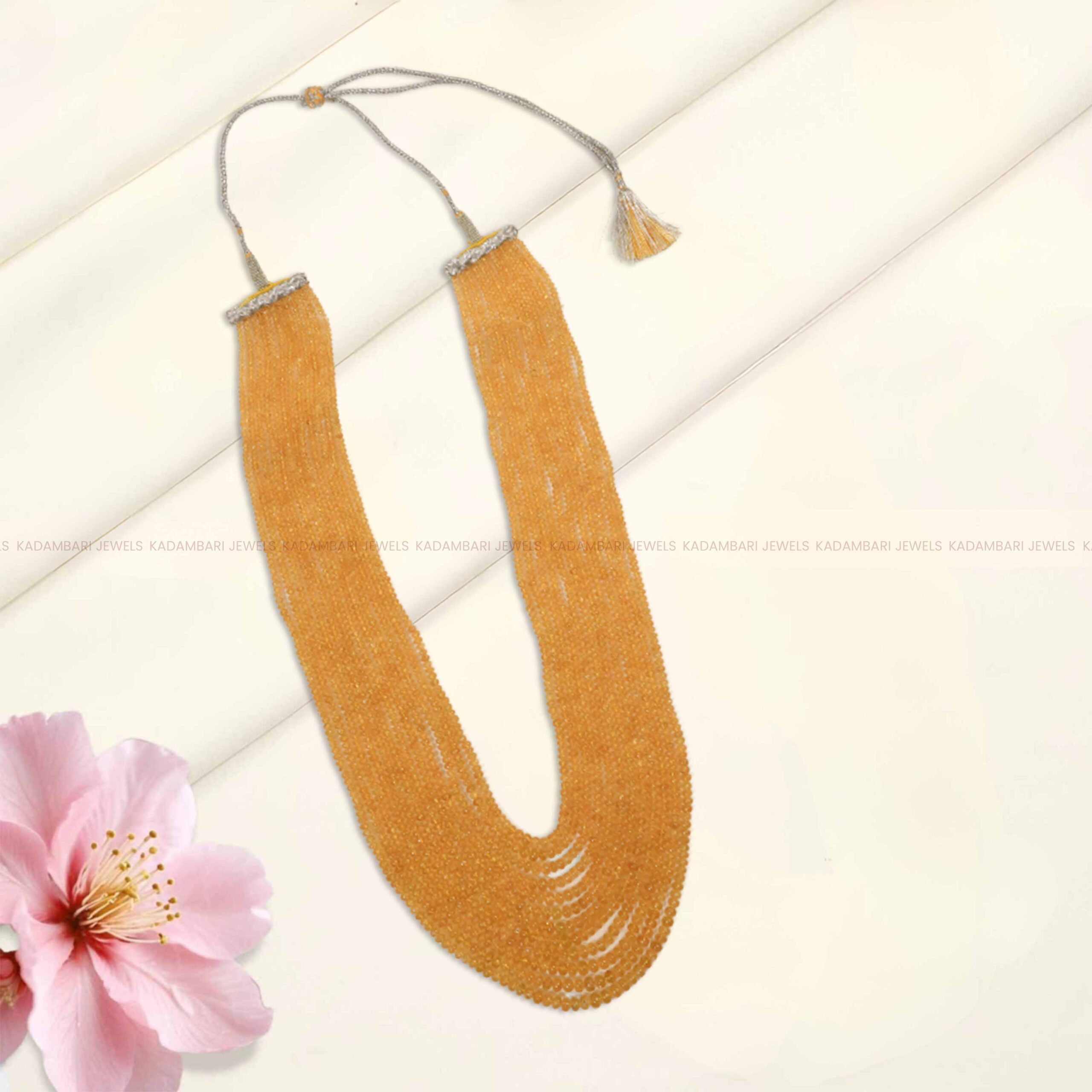 This radiant maala is crafted with multiple strands of sparkling golden citrine beads. The layered design catches the light beautifully, creating a brilliant and eye-catching effect. It is a perfect accessory to bring warmth and a touch of sunshine to your look.