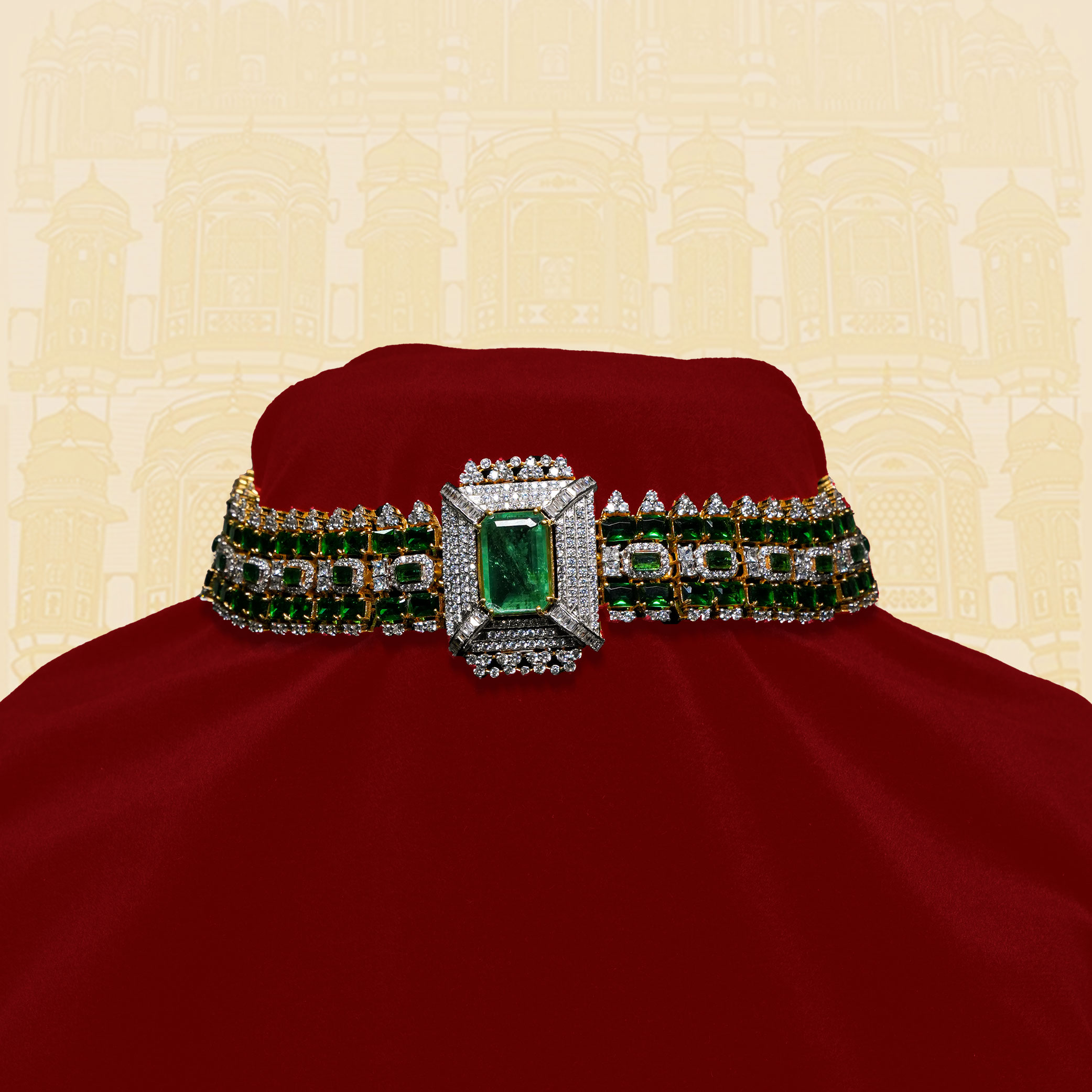 This breathtaking choker is a masterpiece of design, featuring a prominent emerald-cut center stone surrounded by a halo of brilliant diamonds. Flanked by intricate rows of deep green emeralds and sparkling diamonds, this piece exudes regal elegance and luxury. It’s a statement accessory perfect for a grand occasion.