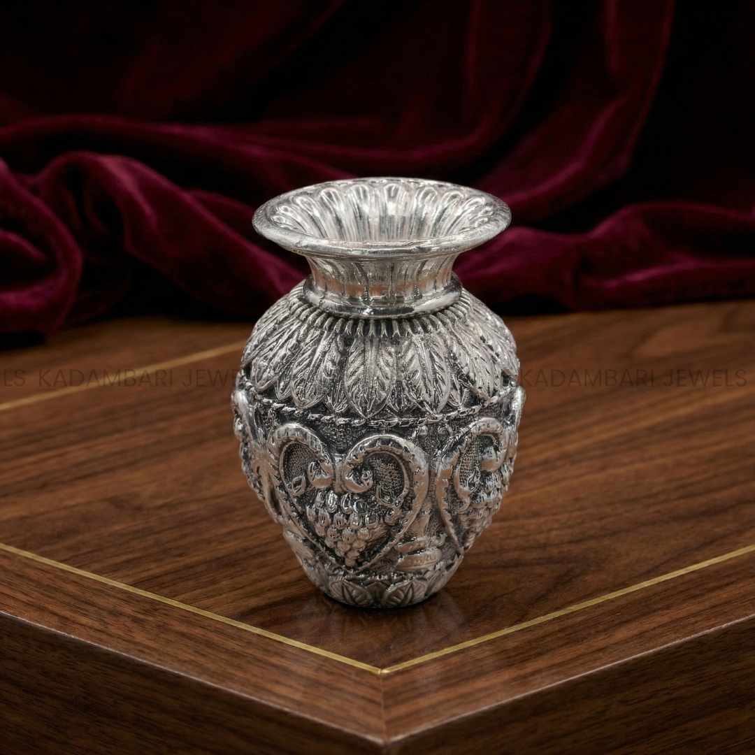 This beautifully crafted silver-plated kalash pot features intricate, detailed carvings and a traditional design. A kalash is a symbol of abundance and wisdom in Hindu mythology, making this piece a perfect addition to your puja room or as a decorative item for your home. Its timeless design makes it a beautiful and auspicious gift for any special occasion.