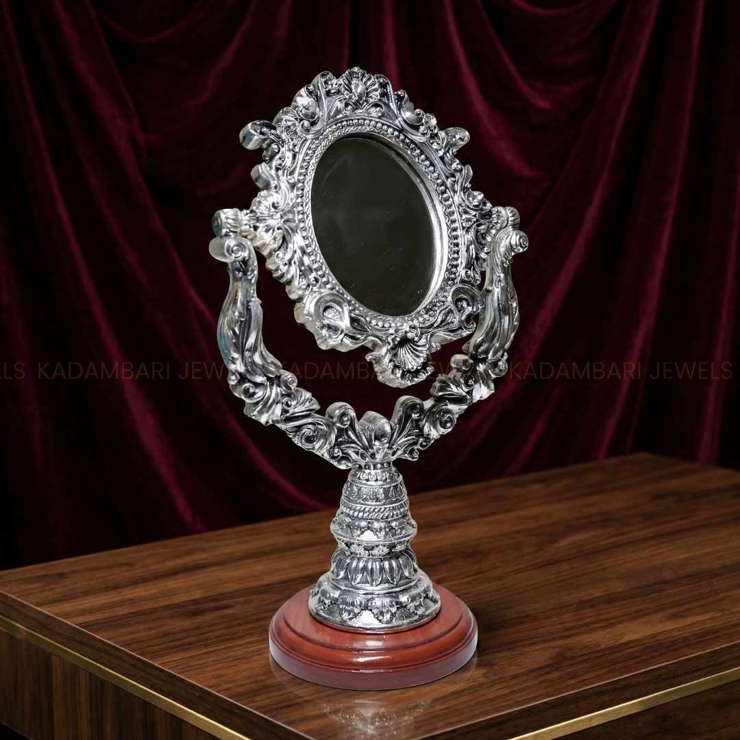 Add a touch of vintage elegance to your dressing table with this stunning silver-plated tabletop mirror. The oval mirror is housed within a beautifully detailed floral and scrollwork frame, all resting on a majestic pedestal base. Its intricate design and polished finish make it a luxurious and functional decorative piece. This is more than just a mirror; it’s a piece of art that reflects classic style and sophistication. A wonderful addition to any bedroom or vanity.
