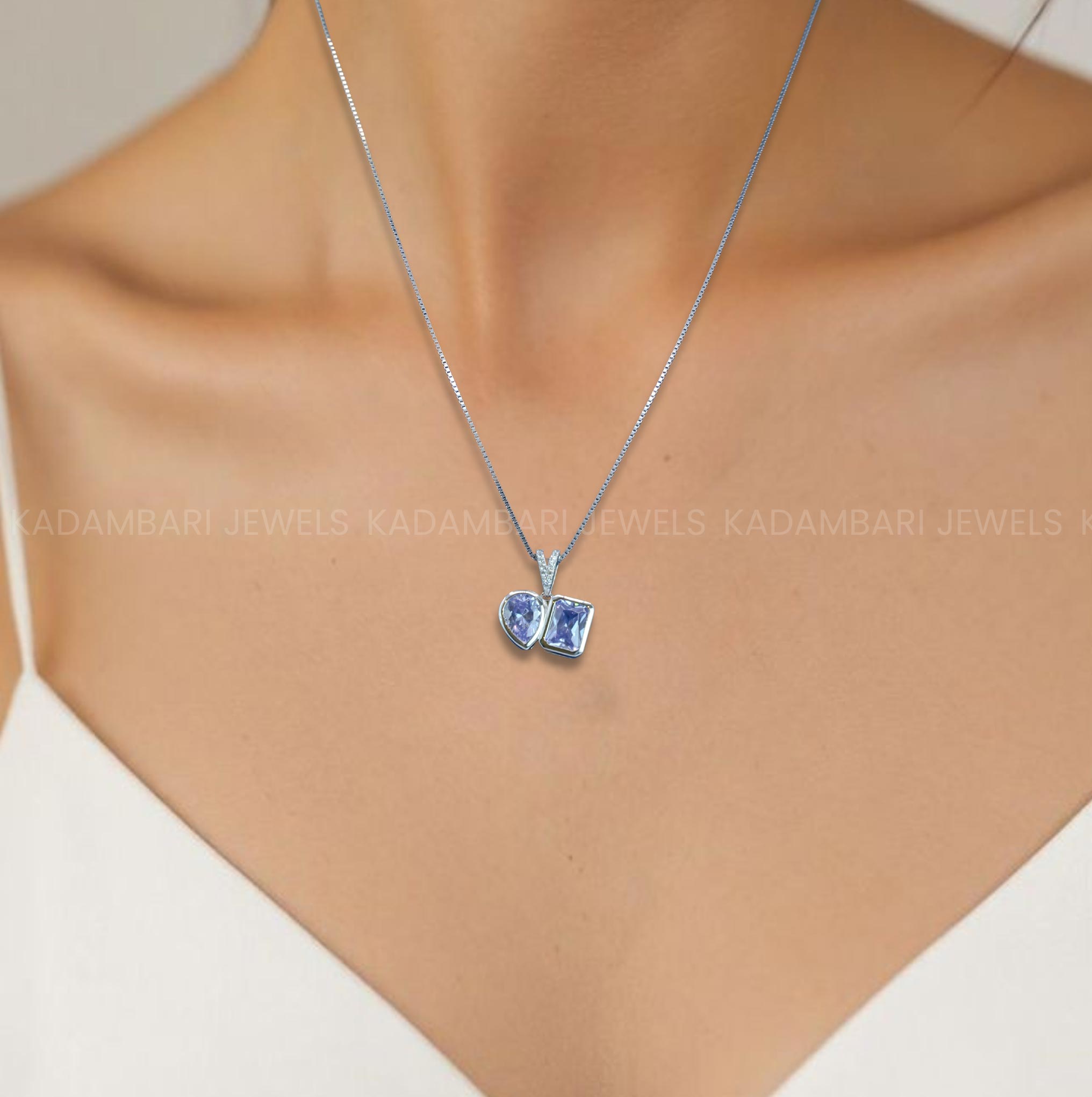 A contemporary take on classic designs. This unique sterling silver necklace features two complementary blue gemstones – a tender heart shape and a chic square cut – creating an eye-catching and modern pendant for everyday wear or special moments.