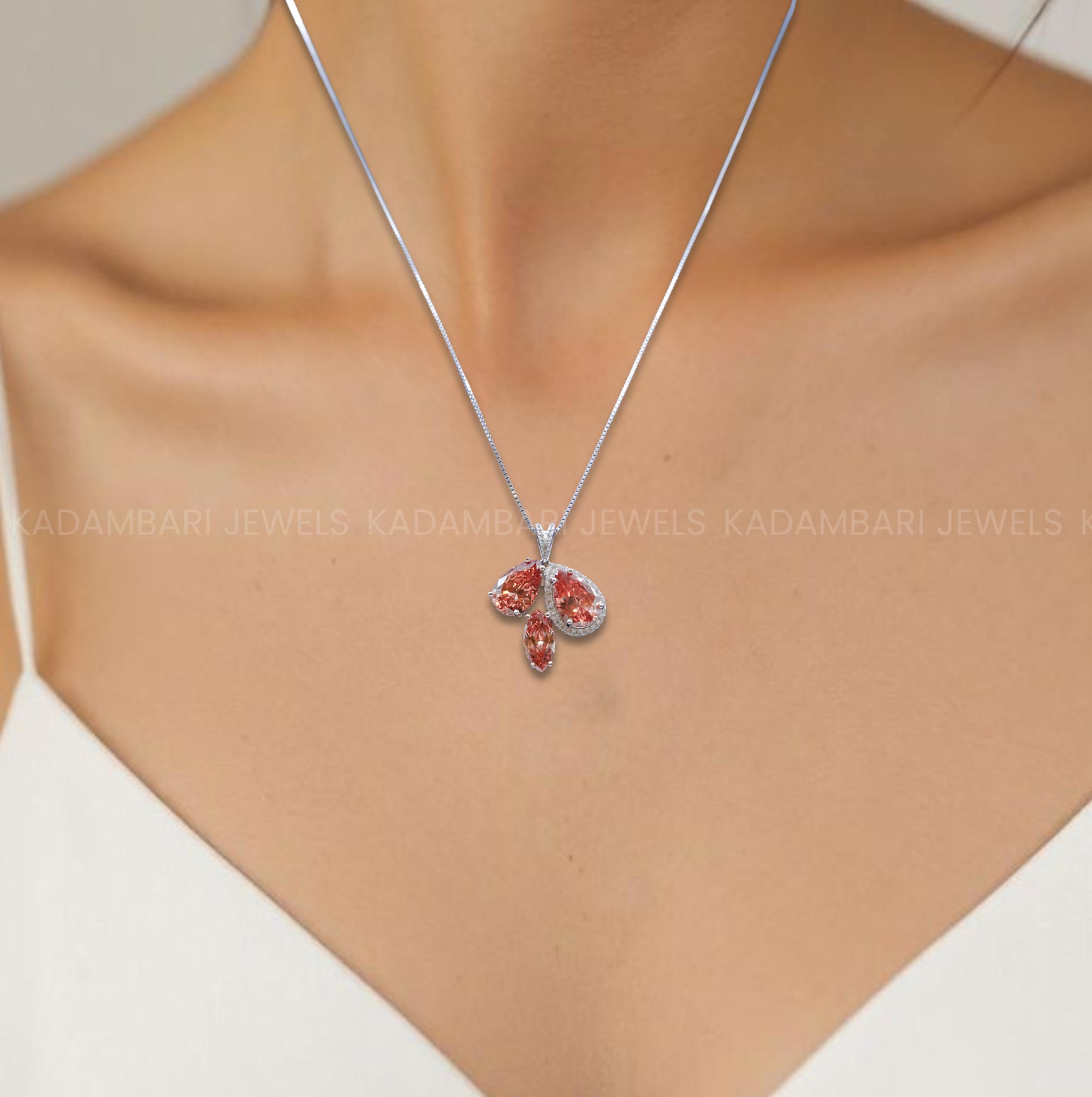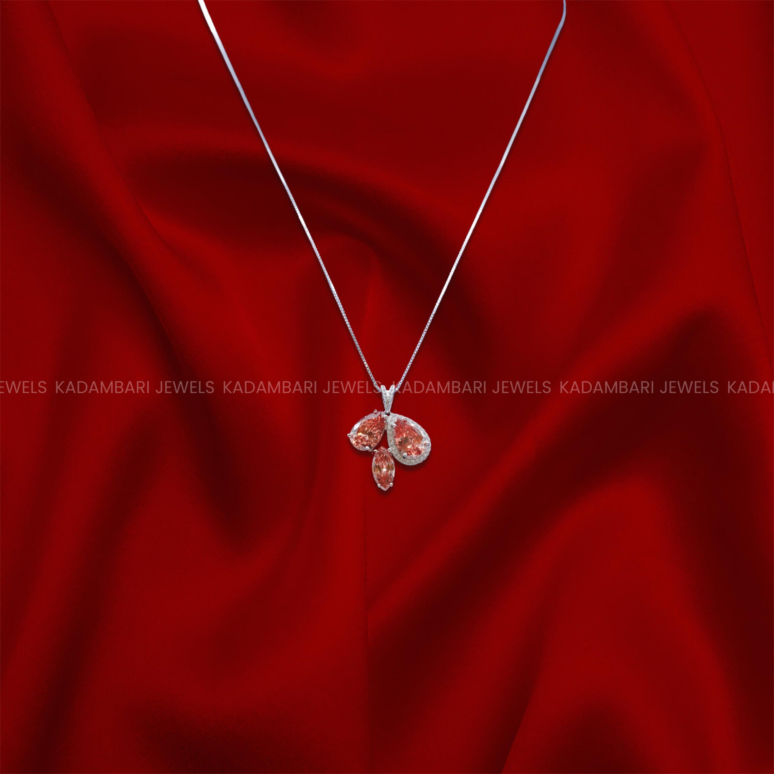 Adorn your neckline with this charming floral-inspired pendant. Three marquise-cut pink gemstones are artfully arranged, accented with shimmering diamonds, creating a delightful and elegant piece that’s perfect for any occasion.