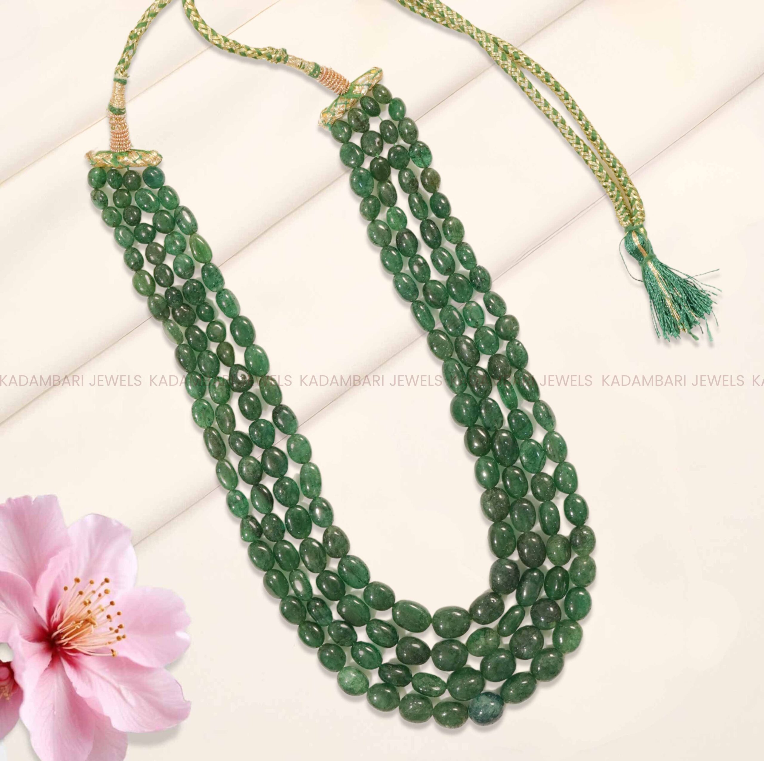 Experience pure opulence with this magnificent emerald beaded necklace. Four sumptuous strands of genuine, high-quality emerald beads cascade beautifully, showcasing their deep, verdant green color and natural character. This luxurious piece makes a powerful statement of style and prestige. Finished with ornate gold-tone clasps and an adjustable cord, it is an heirloom-quality mala designed for life’s most cherished moments, from weddings to grand celebrations.
