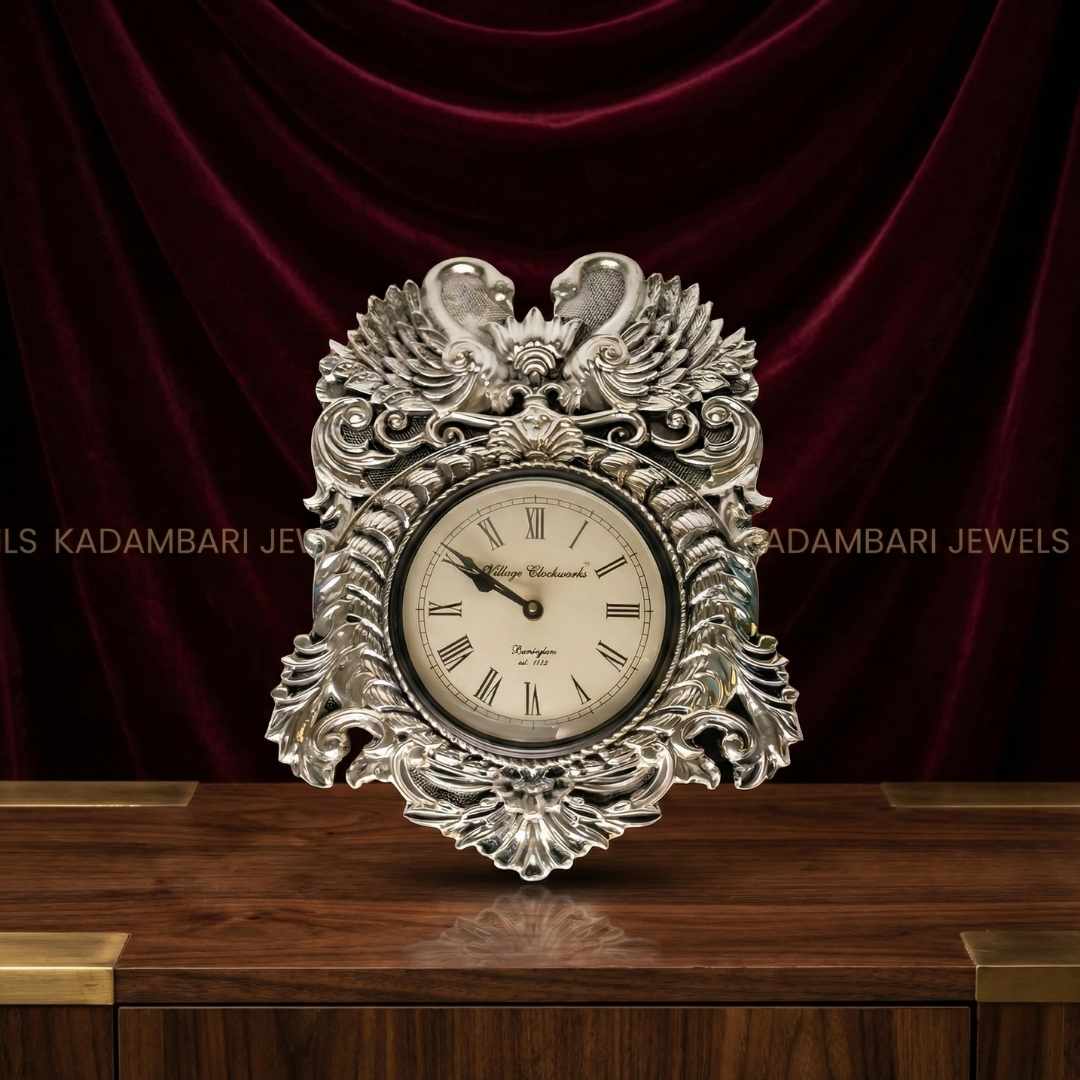 This decorative silver-plated table clock is a masterpiece of design, featuring a classic clock face framed by an ornate, baroque-style border. The base is beautifully adorned with two peacocks, adding a touch of regal charm and elegance. This clock is a perfect fusion of traditional craftsmanship and modern functionality, ideal for any mantelpiece or side table.