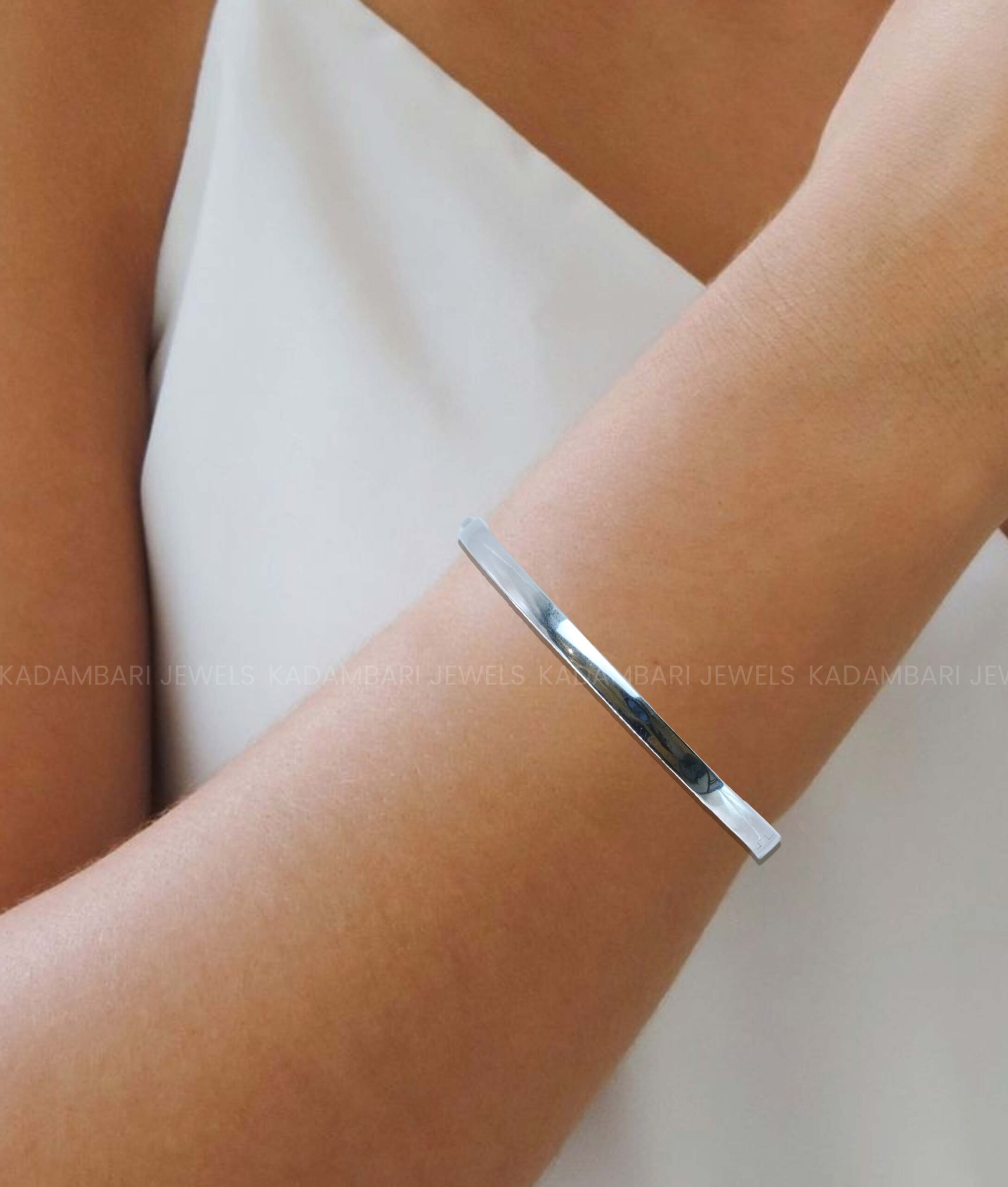 A timeless and minimalist cuff bangle crafted from polished silver. The sleek, bar design offers a modern and clean aesthetic, making it an essential piece for any jewellery collection. This versatile bangle is perfect for everyday wear and can be easily stacked with other pieces for a personalised look.